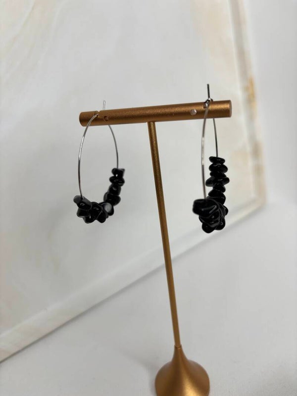 Diese eleganten Creolen mit schwarzen Naturstein-Chips sind ein kraftvolles Statement – schlicht und doch ausdrucksstark. Inspiriert von Onyx oder Obsidian, symbolisieren sie Schutz, Erdung und Selbstbewusstsein. Ideal für alle, die einen zeitlosen Look mit spiritueller Bedeutung lieben.